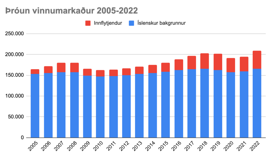 Fjöldi vinnandi handa hefur aukist um tæplega 45 þúsund á þessu tímabili. Af þeirri aukningu eru tæplega 13 þúsund með íslenskan bakgrunn en tæplega 32 þúsund innflytjendur. Frá 2005 hafa innflytjendur því staðið undir 70% af aukningunni.