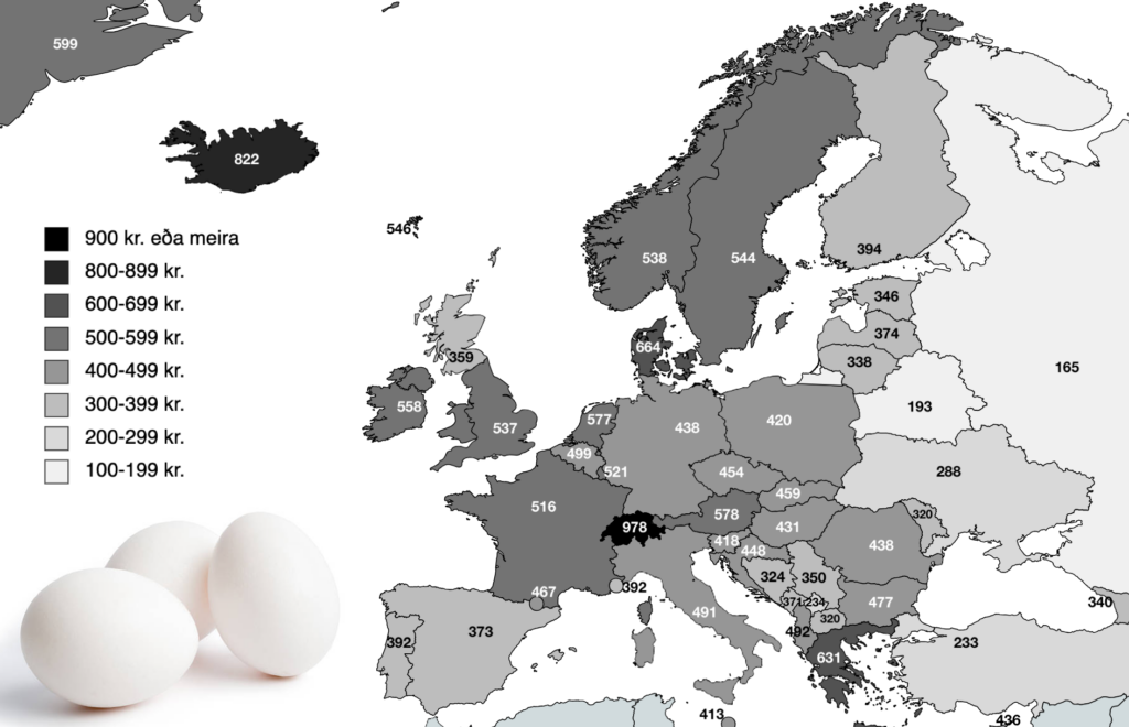 Það eru hvergi dýrari egg í Evrópu en á Íslandi samkvæmt lífskjaravefnum Numbeo. Nema í Sviss, en þar eru laun miklu hærri en á Íslandi. Þótt eggin í Zürich séu 16% dýrari en í Reykjavík þá getur Svisslendingur á lágmarkslaunum keypt 43% fleiri egg fyrir hvern dagvinnutíma, 46 egg þegar íslenskt láglaunafólk fær aðeins 32 egg fyrir klukkutíma vinnu.