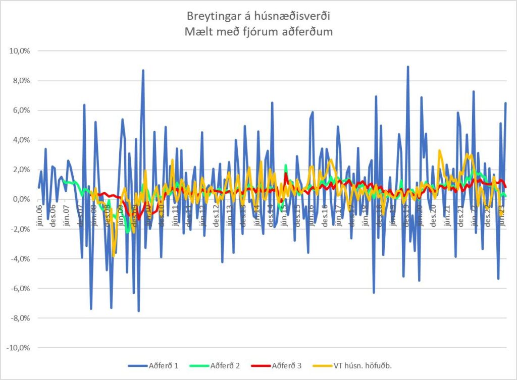 Það kemur ekki á óvart, að í aðferð 1 og vísitölu húsnæðiskostnaðar á höfuðborgarsvæðinu eru miklar sveiflur milli mánaða á myndritinu yfir breytingar á húsnæðisverði. Þetta er einfaldlega það sem búast má við, þar sem fjöldi kaupsamninga er oft mjög misjafn, sama á við um staðsetningu húsnæðis, stærð og tegund. Aðferðum 2 og 3 er ætlað að slá á þessar sveiflur, þó svo að uppsöfnuð hækkun sé nánast sú sama, eins og sést á myndritu með vísitölunni. Með því að slá á sveiflurnar fæst mun jafnari þróun, en seðlabankastjórum hefur verið tíðrætt um sveiflurnar á fasteignamarkaði og oft notað afbrigðilegar breytingar milli mánaða sem afsökun fyrir vaxtaákvörðunum. Hægt hefði verið að nota mun lengri tímabil, t.d. 3 ár eða 5 ár. Gögnin leyfa ekki að tekin séu 15 ár eða 30 ár.