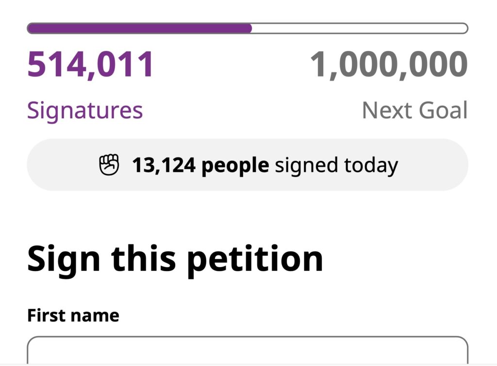 Svo virðist vera sem kröfugerðin hafi vakið athygli á nýjan leik í undanliðinni viku, þegar fjöldi undirskrifta fór yfir hálma milljón. Yfir 13 þúsund undirskriftir söfnuðust á einum degi á föstudag.