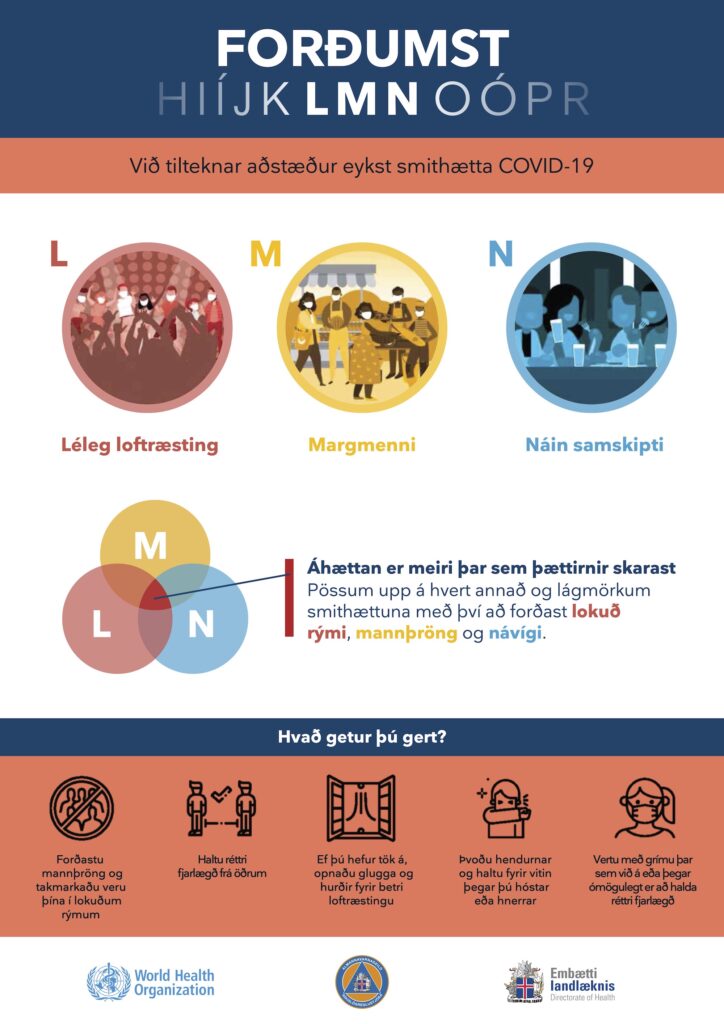 Ofantaldir eru hvattir til að sýna varkárni, sem fyrr segir, án þess að forðast samneyti við annað fólk, viðhafa smitvarnir „sem felast í að viðhafa 1 metra nándarmörk og forðast fjölmenni eins og kostur er“. Þá er sagt að andlitsgrímur eigi við „í ákveðnum kringumstæðum“ og „tíður og góður handþvottur/handsprittun“ eigi alltaf við. Loks er þeim sem umgangast einstaklinga í áhættuhópum bent á sömu atriði og áhersla lögð á að „þeir haldi sig fjarri þeim ef þeir hafa einkenni sjúkdóms eða greinast með COVID-19.“