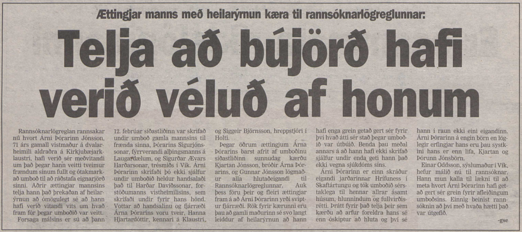 Rannsóknarlögreglan rannsakar nú hvort Árni Þórarinn Jónsson, 71 árs gamall vistmaður á dvalarheimili aldraðra á Kirkjubæjarklaustri, hafi verið sér meðvitandi um það þegar hann veitti tveimur frændum sínum fullt og ótakmarkað umboð til að ráðstafa eignarjörð sinni. Aðrir ættingjar mannsins telja hann það þrekaðan af heilarýrnun að ómögulegt sé að hann hafi verið vitandi vits um hvað fram fór þegar umboðið var veitt.