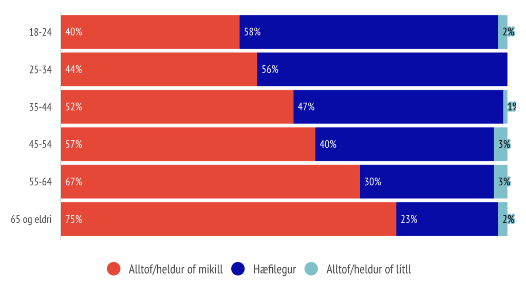 Þarna sést að það er ekki fyrr en í aldurshópnum 35-44 ára sem meirihlutinn segir of mikið af ferðafólki. Í elsta hópnum, yfir 65 ára, er þetta hlutfall orðið 75%.