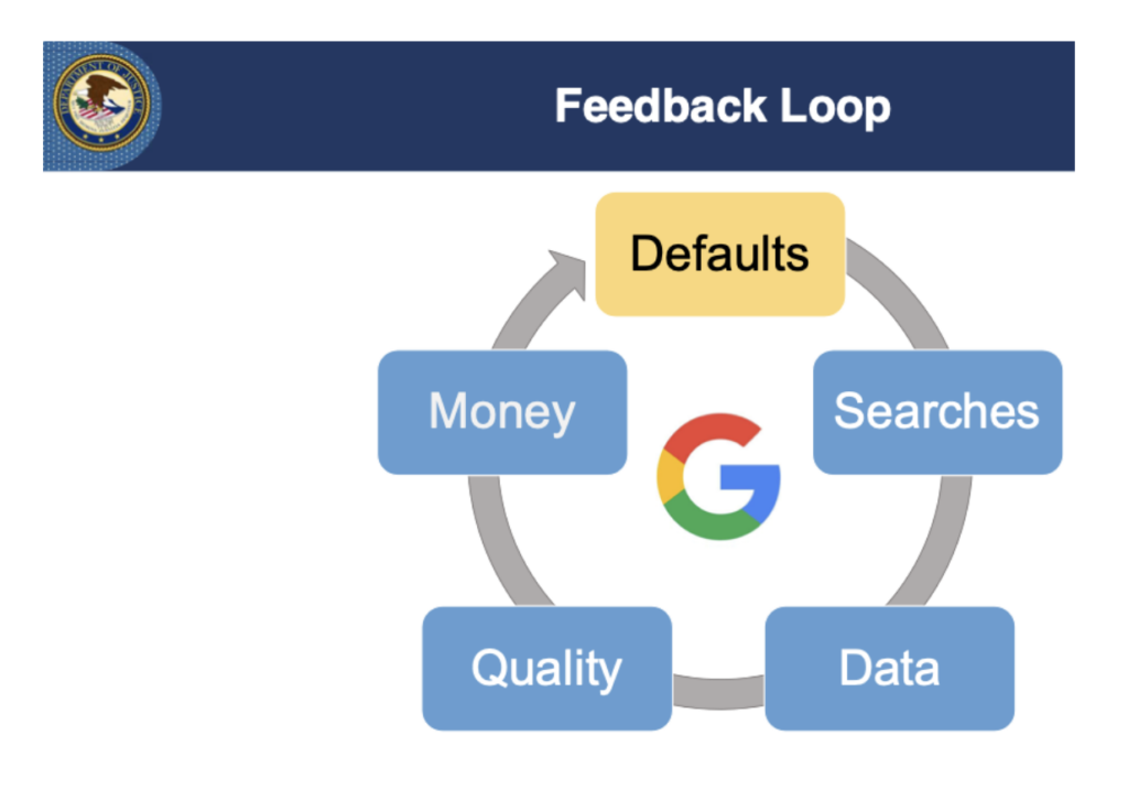 Viðskiptamódel Google byggir á að notandinn greiði ekki beint fyrir notkunina sjálfa heldur safnar Google upplýsingum um notendur og selur fyrirtækjum. Málið er því snúið en lykillinn að sókn yfirvalda er að google-leitarvélin sé sjálfgefin, sem leiði til minni gæða, skerts einkalífs notenda og hærra vöruverðs, sjá hér eina glæru saksóknara frá réttarhöldunum um viðskiptamódel Google.