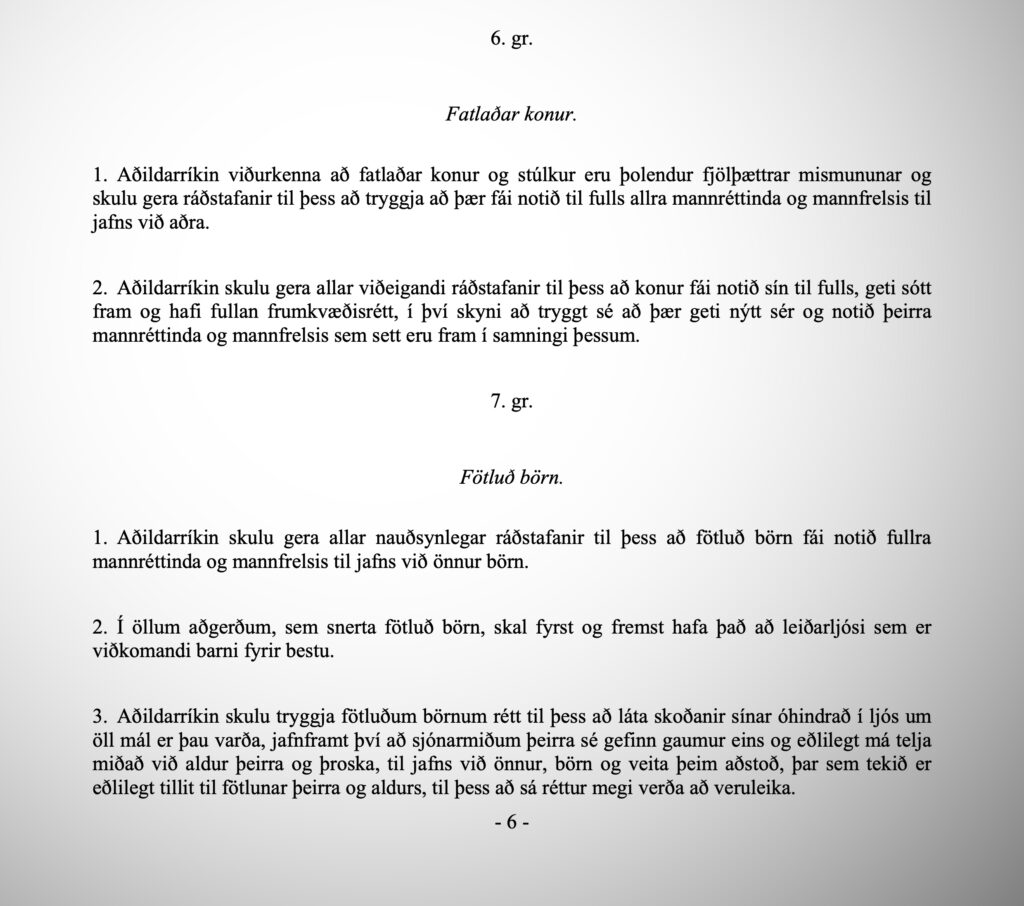 6. og 7. grein samnings SÞ um réttindi fatlaðs fólks, sem Ísland hefur undirritað og fullgilt, kveða sérstaklega á um rétt fatlaðra kvenna og fatlaðra barna.
