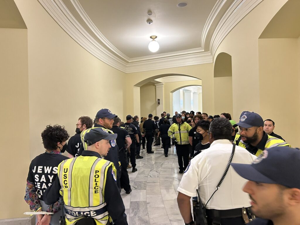 Samtökin If Not Now og Jewish Voice for Peace (JVP) stóðu saman að mótmælunum. JVP greindu frá mótmælaaðgerðinni á Twitter á meðan hún stóð yfir og skrifuðu meðal annars: „Við erum hér til að segja: ekki í okkar nafni og aldrei aftur. Og við munum halda áfram borgarlegri óhlýðni þar til þingið kallar eftir vopnahléi á Gasa eða neyðir okkur til að fara.“ Þau segja vopnahlé vera „fyrsta skrefið til að stöðva yfirstandandi þjóðarmorð Ísraelshers gegn tveimur milljónum Palestínumanna í Gasa undir umsátri, án útleiðar.“