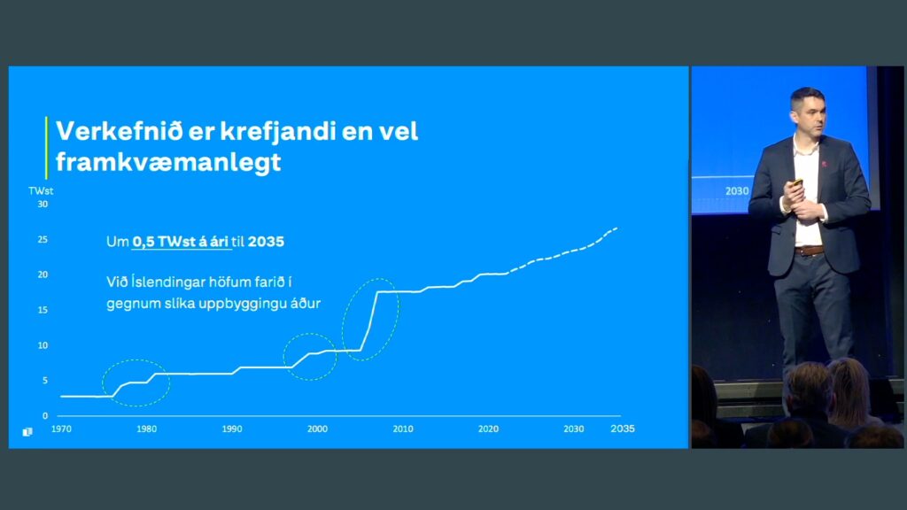 Guðlaugur sagðist hafa hitt varakanslara Þýskalands um daginn. „Úff,“ bætti hann við. „Hann er ekki með auðvelt verkefni. Því að öll hús í Þýskalandi eru meira og minna – þó svo að þeir hafi jarðvarma, eins og við, því að jarðvarmi er úti um allt saman – að þau eru tengd með innviðum sem byggja á gasi og öðru slíku. Þannig að þetta snýr að umhverfismálum, þetta snýr að efnahagsmálum og þetta snýr að þjóðaröryggismálum. Því að þjóðaröryggi okkar er miklu betra vegna þess að við erum að nota græna íslenska orku að langstærstum hluta.“