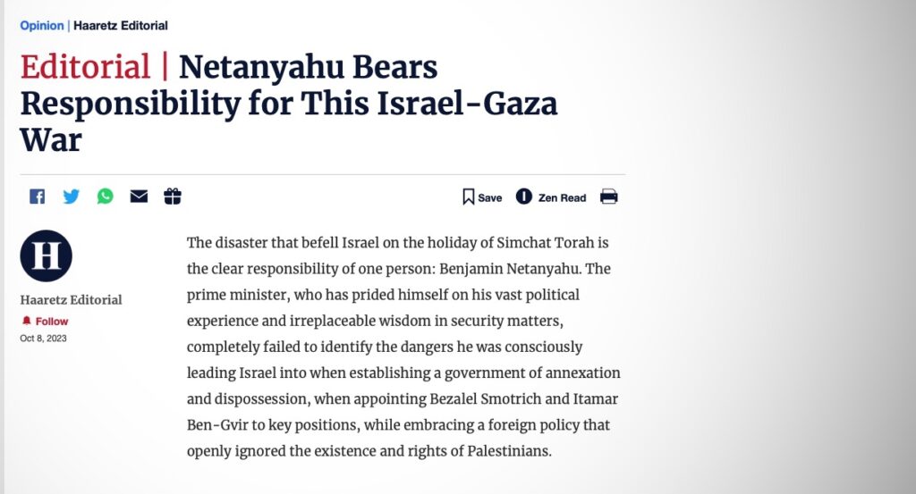 Ísraelska dagblaðið Haaretz sagði í afdráttarlausum leiðara á laugardag að Benjamin Netanyahu, forsætisráðherra Ísraels, beri einn ábyrgð á árás Hamas-liða á laugardag, þeirri banvænustu sem framin hefur verið gegn Ísrael, á ísraelsku landsvæði, í fimmtíu ár. Blaðið sagði Netanyahu hafa mistekist að bera kennsl á þá hættu sem hann stofnaði meðvitað til með því að reka stefnu í þágu landtöku og eignanáms, með því að hunsa tilveru og réttindi Palestínumanna, og með skipan hægri-öfgamanna í lykilstöður ríkistjórnarinnar.