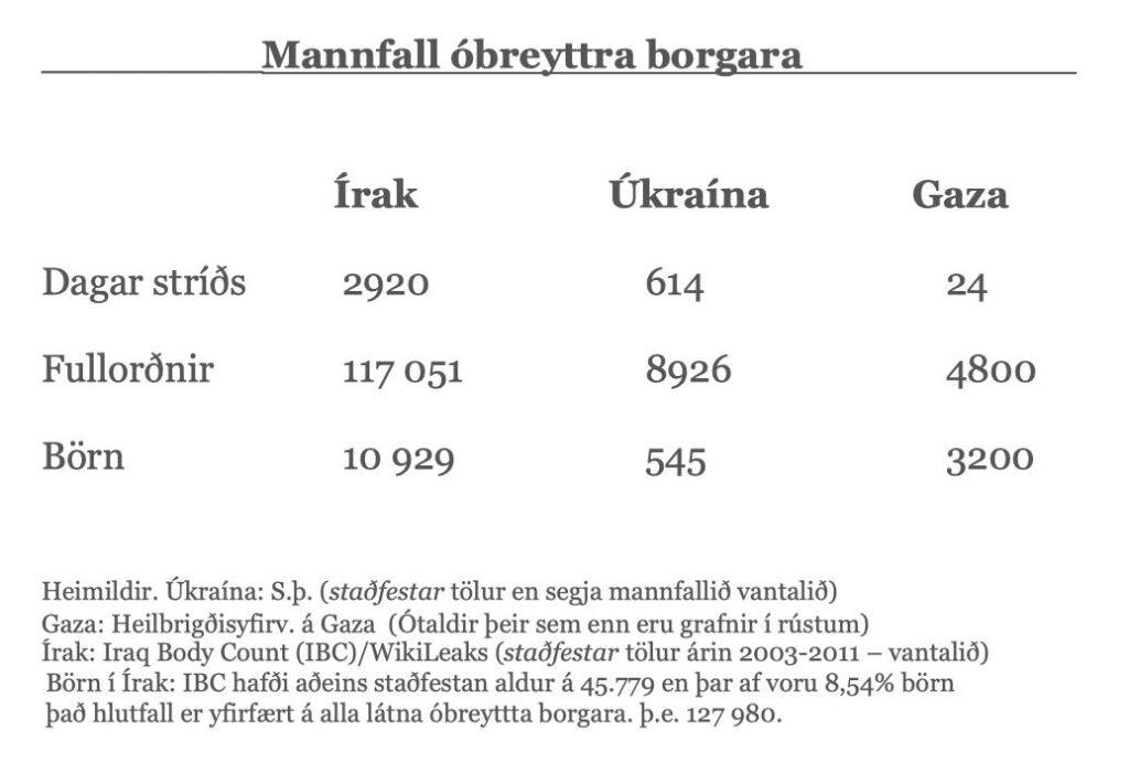 Til að draga þetta fram tók ég saman tölur um mannfall óbreyttra borgara í Írak á átta ára tímabili (2003-2011), í Úkraínu á 19 mánaða tímabili (frá 24. febrúar í fyrra) og núna á Gaza á aðeins 24 dögum.
