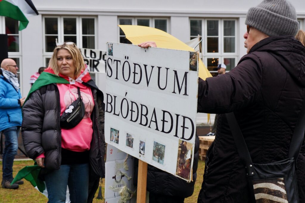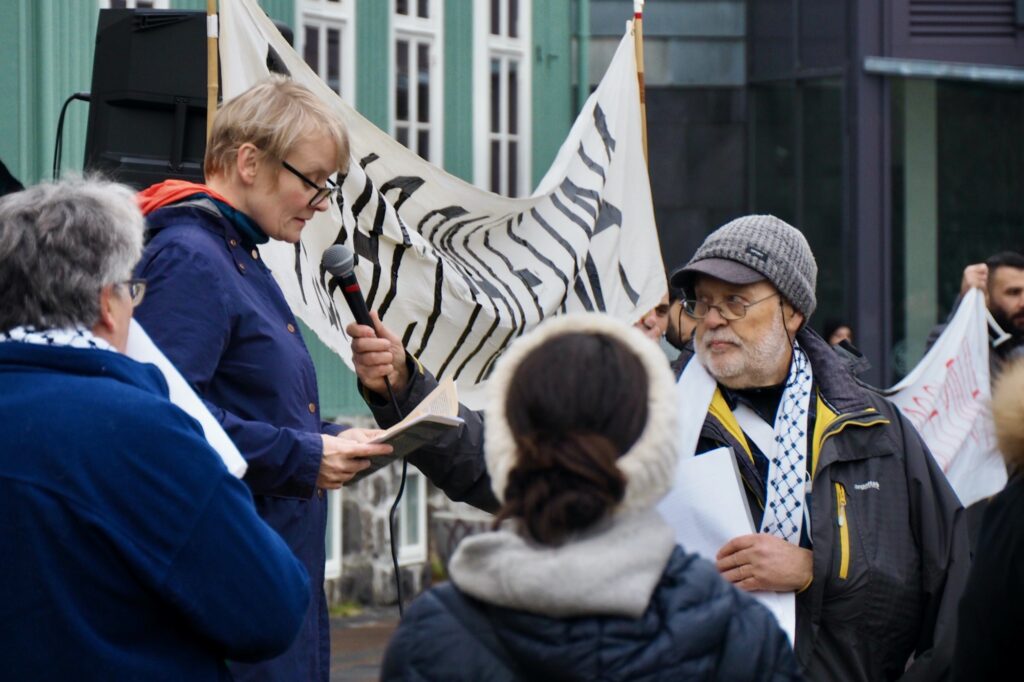 „Því það hafið þið gert. Þið getið ekki þvegið hendur ykkar af blóði þessa fólks,“ sagði Ögmundur. Þá sagði hann að íslensk stjórnvöld yrðu að setja fram afdráttarlausar kröfur um að „árásarstríði Ísraelshers verði hætt þegar í stað“, „ólöglegar landránsbyggðir“ lagðar af, þau landamæri virt „sem Sameinuðu þjóðirnar hafa margoft ályktað um“, „stærsta fangelsi heimsins, Gasasvæðið“ opnað og aðskilnaðarstefnan aflögð.
