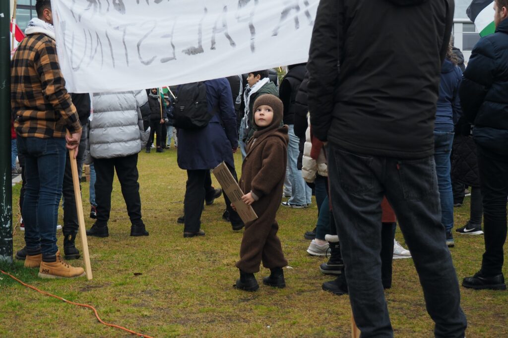 Yfir vellinum blakti fjöldi palestínskra fána, auk fána frá Húmanistaflokknum. Á skiltum og borðum mátti meðal annars lesa „STÖÐVIÐ STRÍÐSGLÆPINA“, „STÖÐVUM BLÓÐBAÐIГ, „Frið í Palestínu!“, „RJÚFIÐ HERKVÍNA“, „ÍSRAELSHER BURT ÚR PALESTÍNU!“, „HÆTTIÐ AÐ VOPNA ÍSRAELSHER“, „FRJÁLS PALESTÍNA“, „ALÞJÓÐLEGA VERND FYRIR PALESTÍNUMENN“ og „MENNSKA FRAMTÍГ. Ungur maður í samfestingi minnti á að „HELMINGUR ÍBÚA GAZA ERU BÖRN!“.