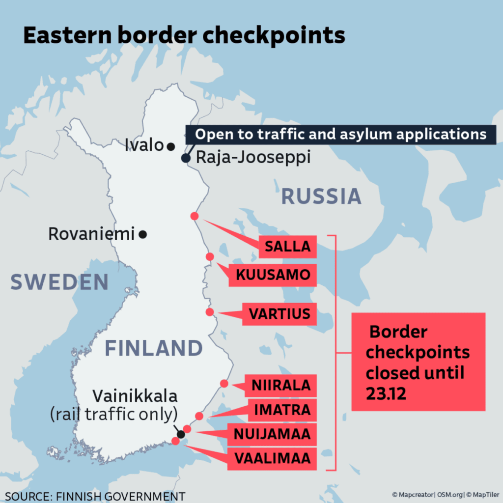 Finnsk stjórnvöld hafa miðlað þeim skilningi undanliðnar vikur að flóttafólkinu sé, ef ekki stýrt af rússneskum stjórnvöldum, þá að minnsta kosti hleypt að landamærunum, með það að augnamiði að setja öryggismál Schengen-svæðisins úr skorðum. Það var ástæðan sem finnsk stjórnvöld tilgreindu er þau tilkynntu um miðjan þennan mánuð að frá og með 18. nóvember yrði flestum landamærastöðvum milli landanna lokað og aftur þegar þau tilkynntu nokkrum dögum síðar, á miðvikudag í síðustu viku, að þau hygðust loka öllum stöðvum nema einni, Raja-Jooseppi-stöðinni, þeirri nyrstu og afskekktustu, norðarlega á Lapplandi.