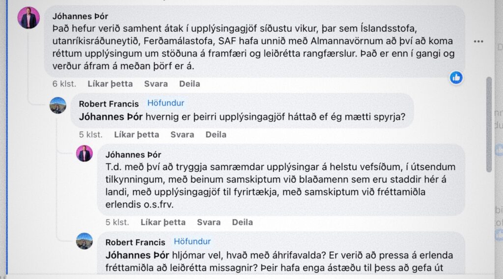 Í umræðum undir færslunni birtist engin gagnrýni á þá hugmynd að stjórnvöld leyfi fulltrúum hagsmunaaðila í ferðaiðnaði að hafa afskipti af upplýsingamiðlun Almannavarna í þágu iðnaðarins, heldur virtust meðlimir hópsins frekar vilja meira af því sama. Eftir að Jóhannes taldi upp þær leiðir sem stjórnvöld beita nú þegar í þessu augnamiði var hann þannig spurður: „Hljómar vel, hvað með áhrifavalda? Er verið að pressa á erlenda fréttamiðla að leiðrétta missagnir? Þeir hafa enga ástæðu til þess að gefa út tilkynningar sem eru ekki jafn góð clickbeita og „Ísland gliðnar í sundur“ án þess að pressa einhvernveginn á þau.“