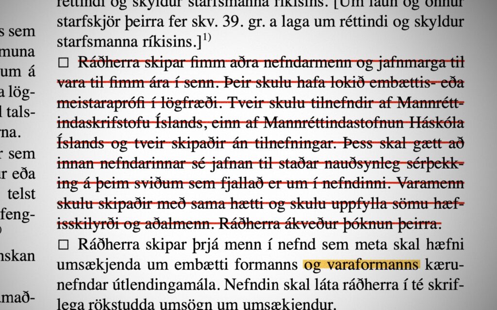 Dómsmálaráðherra hefur kynnt frumvarp um breytingar á lögum um útlendinga. Breytingarnar snúast um meðferð umsókna um alþjóðlega vernd og eru kynntar á forsendum „samræmis“ og „skilvirkni“ en er leynt og ljóst ætlað að takmarka áhrif mannréttindasjónarmiða á afgreiðslu umsókna. Með breytingunum yrðu áhrif slíkrar þekkingar nær engin innan kærunefndar útlendingamála. Þá yrði stjórnvöldum ekki lengur skylt að skipa umsækjendum um vernd talsmann eða að slíkur talsmaður sé viðstaddur yfirheyrslur. Að samanlögðu má ætla að fjölga myndi mjög þeim tilfellum sem starfsmenn Útlendingastofnunar geta synjað nær hindranalaust.