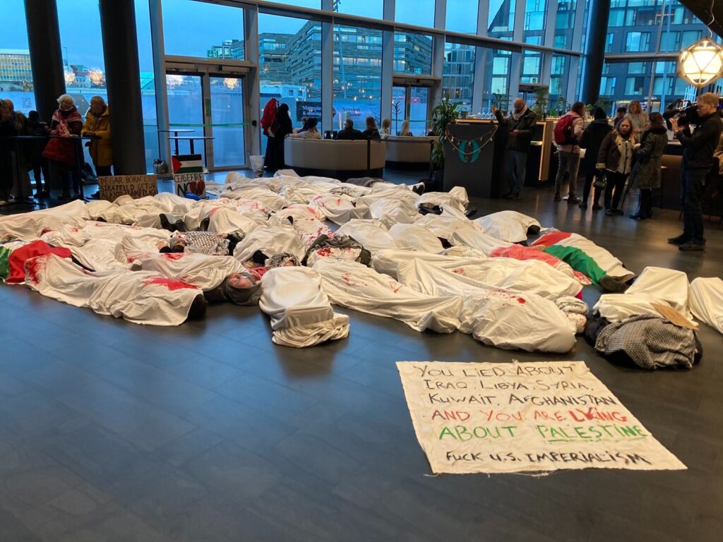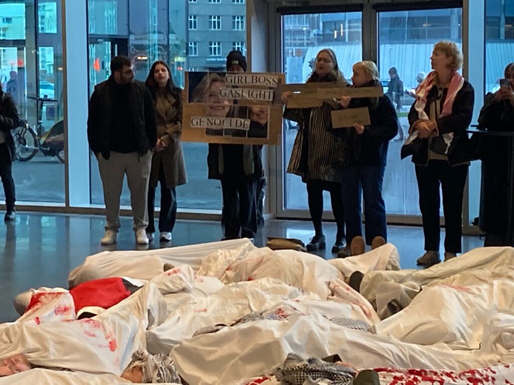 Tugir þátttakenda, sveipaðir hvítum klæðum, komu saman kl 15:30, lögðust á gólfið í anddyri Hörpu, og lágu þar kyrr til að minna á mannfallið á Gasa, undir árásum Ísraelshers. Skömmu síðar stóðu þau upp og hófu hefðbundnari mótmæli, hrópuðu þau slagorð sem heyrst hafa um allan heim undanliðnar vikur: Free free Gaza, Ceasefire Now, Boycott Clinton, ásamt slagorðum á íslensku: Vopnahlé strax og Frjáls Palestína.