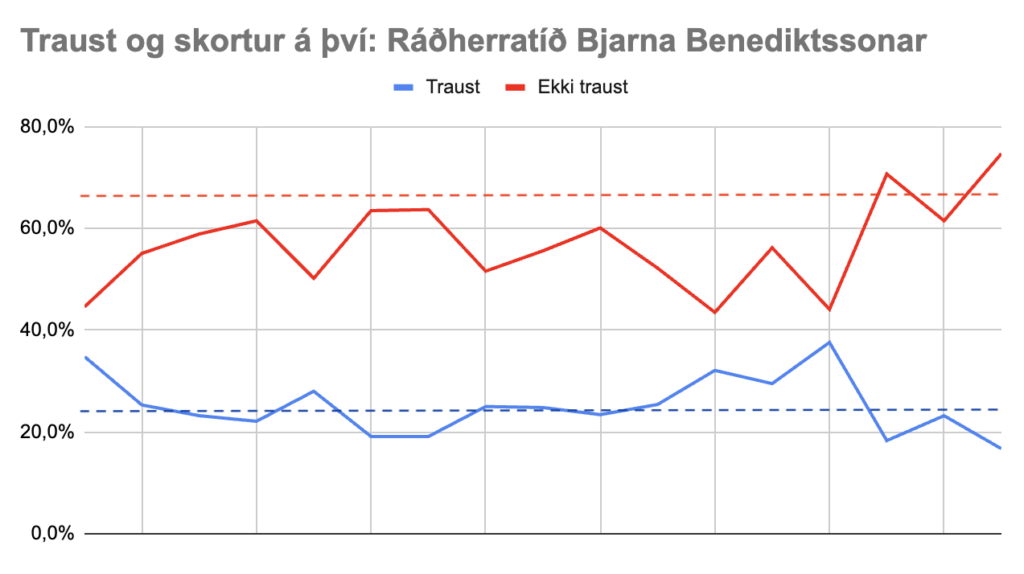Þetta sýnir mælingar á trausti almennings til Bjarna frá því hann varð fjármálaráðherra 2013 og fram í síðasta mánuð, þegar hann hafði vikið úr fjármálaráðuneytinu vegna Íslandsbankasölunnar og fært sig yfir í utanríkisráðuneytið.