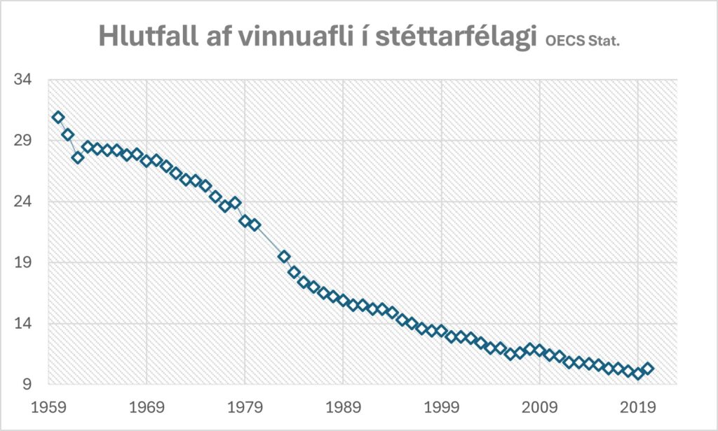 Mynd: Línurit sem sýnir þróun stéttarfélaagaðildar í Bandaríkjunum frá 1960 til 2020.