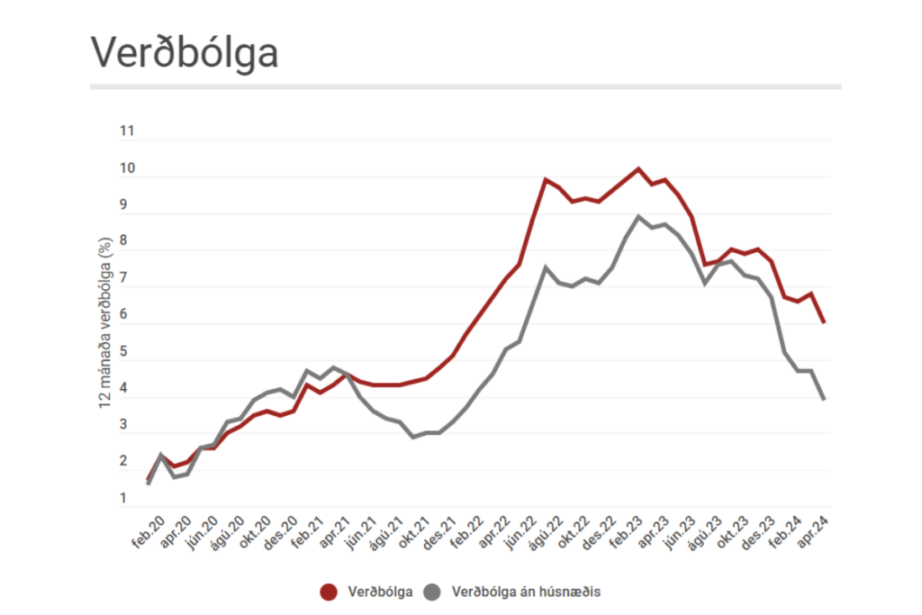 Vísitala neysluverðs hækkar um 0,55% milli mánaða og mælist verðbólgan í apríl því 6,0% samanborið við 6,8% í mars og hefur ekki verið lægri síðan í upphafi árs 2022.