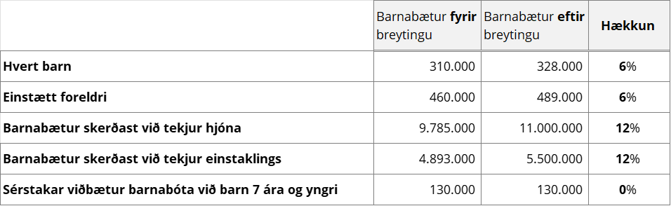 Eins og tafla 1 sýnir, þá hækka barnabætur um 6% bæði fyrir hvert barn og barn einstæðs foreldris. Skerðingahlutfall barnabóta er hækkuð um 12%, bæði fyrir einstaklinga og hjón.