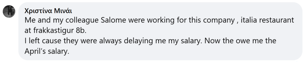 Salome stendur ekki ein í baráttu sinni; aðrir fyrrverandi starfsmenn “Italia” og annars veitingastaðar í eigu Opera Service ehf, “Antico”, hafa einnig stigið fram með kröfur um ógreidd laun. Χριστίνα Μινάι, fyrrverandi starfsmaður, hefur til dæmis haldið því fram að hún eigi inni laun frá apríl.