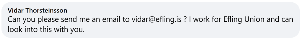 Viðar Thorsteinsson, fulltrúi Eflingar, hefur boðist til að veita Salome aðstoð í kjölfar innleggs hennar á Facebook hópnum Vinna með litlum fyrirvara.