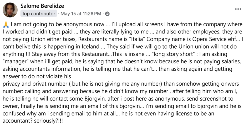 Salome deildi reynslu sinni í Facebook-hópnum „Vinna með litlum fyrirvara“, þar sem hún lýsti erfiðleikum sínum við að innheimta laun frá janúar, þegar hún byrjaði hlutastarf á staðnum. Hún hefur ítrekað óskað eftir launaseðlum en segir að einungis hafi henni sýndar tímaskráningar á skjá og aldrei afhent formleg gögn.