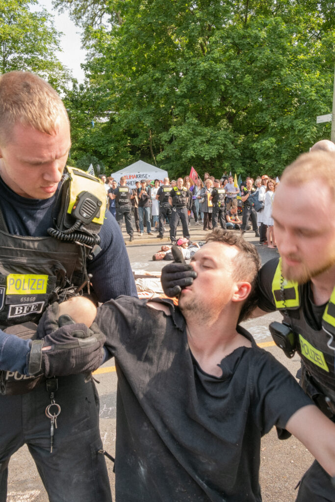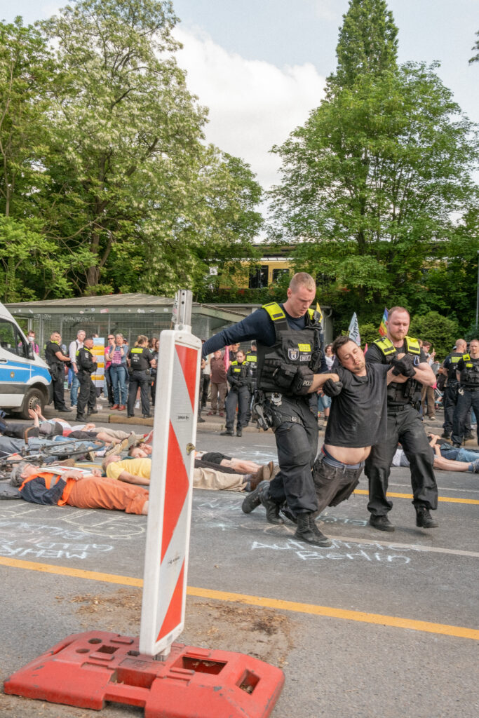 Mótmælin hófust með mótmælafundi og síðar setuverkfalli fólks á umferðargötu í borginni, þar sem tugir mótmælenda lögðust á götuna og stöðvuðu umferð. Grétar segir að töluverður fjöldi fólks hafi verið á mótmælunum, bæði virkir þátttakendur og stuðningsfólk sem sýndi samstöðu í verki. „Það var allt alveg fullt af löggum, nánast jafn margar og mótmælendur eða fleiri. Það er alltaf þannig hér í Berlín þegar kemur að mótmælum sem snúa að loftslagsmálum eða Palestínu, þá eru iðulega fleiri löggur en mótmælendur.“