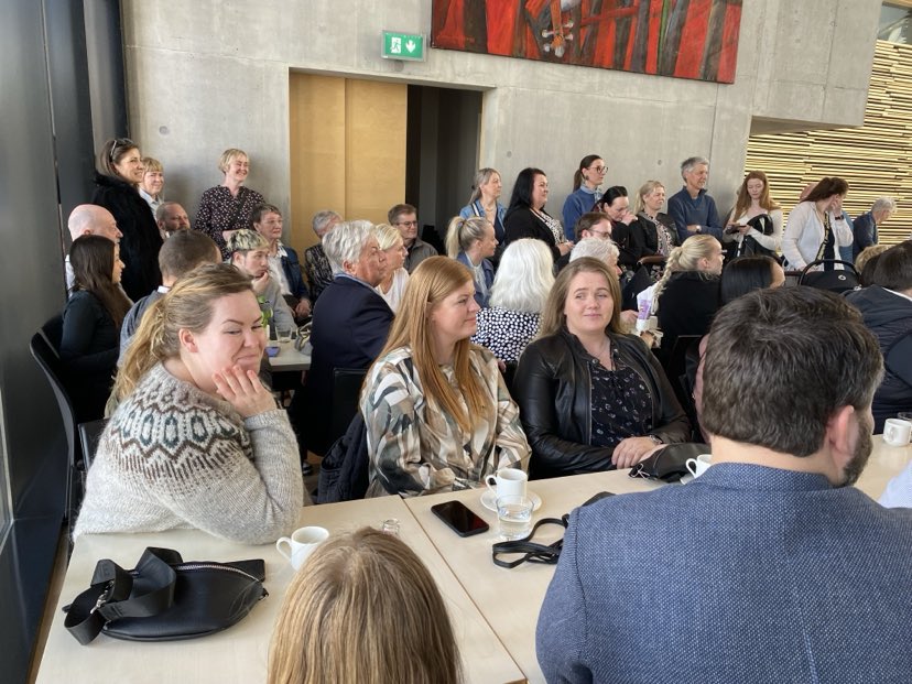 Færa þurfti hluta gesta á framboðsfundi Höllu Tómasdóttur forsetaframbjóðandi milli hæða vegna fjölmennis í dag.