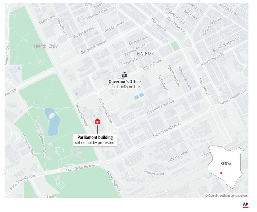Þúsundir mótmælenda sem voru að mótmæla skattahækkunum réðust inn í þinghús Kenía í höfuðborginni Naíróbí á þriðjudag, sendu þingmenn á flótta og brenndu hluta byggingarinnar. Lögreglan skaut á mótmælendur, drap 5 og særði 200, a.m.k. 45 hafa verið lagðir inn á sjúkrahús.