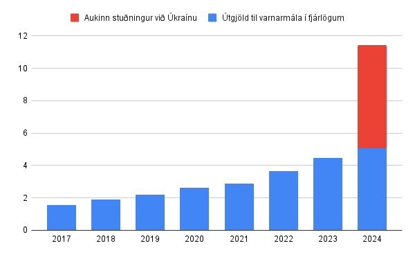 Þar að auki er ljóst að þessu aukni fjárhagslegi stuðningur eykur gríðarlega útgjöld ríkisins til varnarmála, en í fjárlögum síðustu ára hefur sú upphæð hækkað jafnt og hægt úr 1,5 milljörðum árið 2017 upp í 5 milljarða í fjárlögum þessa árs. Þessi aukni stuðningur upp á rúmlega 6 milljarða aukreitis að meðaltali á ári, þ.e. þessir 25,5 milljarðar á tímabilinu 2024-2028, gerir það að verkum að varnarmálaútgjöld íslenska ríkisins hafa rúmlega tvöfaldast og tekið þannig stórt stökk.