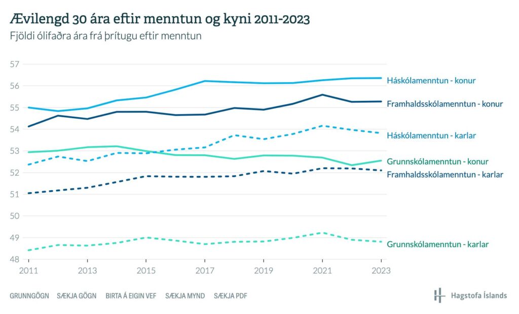 „Háskólamenntaðir karlar lifa um 5 árum lengur en karlar með grunnskólamenntun, sem oftast eru í verkamannastörfum. Ef verkarlar eru bornir saman við háskólamenntaðar konur þá er munurinn tæplega 8 ár. Meðalævilengd verkakarla hefur lækkað undanfarin tvö ár.“