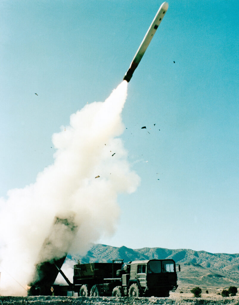 Ljósmynd frá 1982: Tomahawk stýriflaug er skotið á loft af BGM-109G Gryphon eldflaugatrukk. Tomahawk stýriflaugin drífur yfir 1.000 mílur og getur borið kjarnaodda. Þessi eldflaugakerfi voru bönnuð samkvæmt INF samningnum, þar sem samningurinn lagði bann við „ground-launched cruise missiles“ (GLCM).