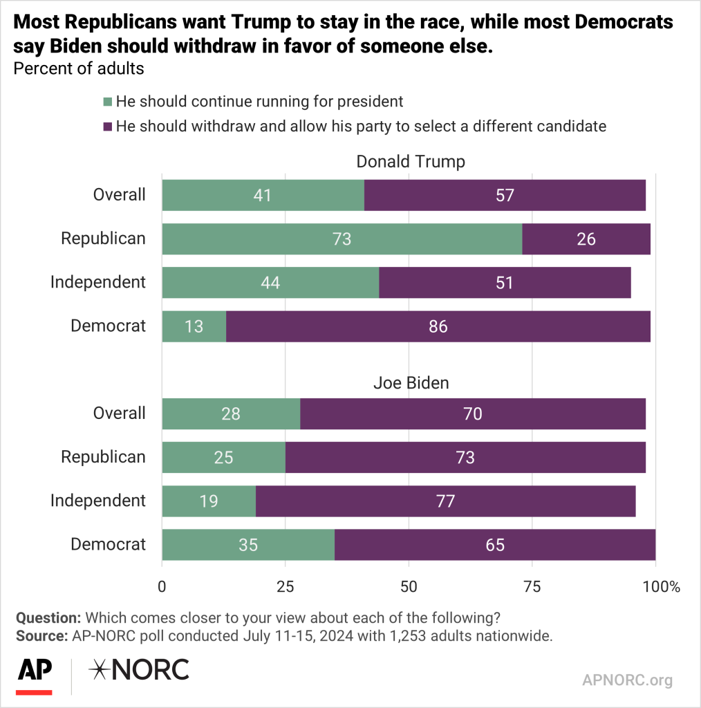 Þetta kemur einnig eftir að niðurstöður könnunar AP voru birtar sem sýna að 65% (eða tveir þriðju) af Demókrötum vilja að Biden dragi sig til baka úr forsetakosningunum.