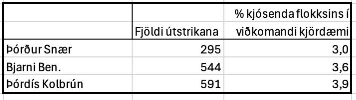 „Hlutfall kjósenda viðkomandi flokks í kjördæminu er einnig sýnt. Um 3% kjósenda Samfylkingarinnar strikuðu yfir Þórð Snæ en 3,6% hjá Bjarna og 3,9% hjá Þórdísi Kolbrúnu. Þórður Snær virðist mega vel við una í þessum samanburði.“