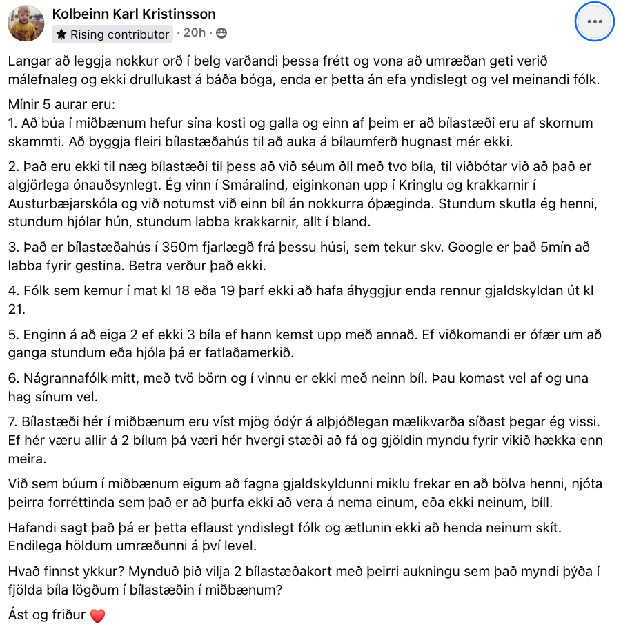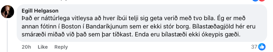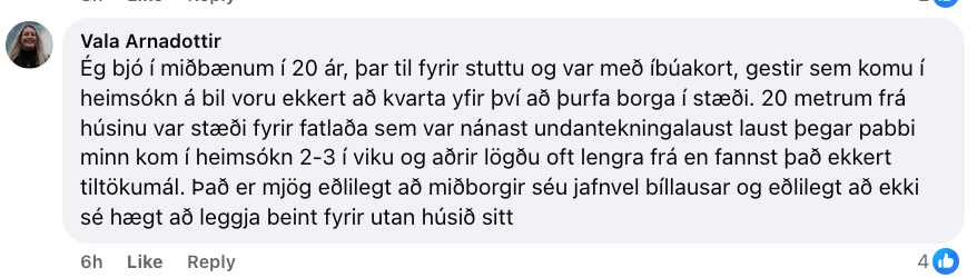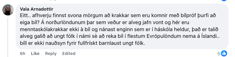 „Talið alveg galið að ungt fólki í námi reki bíl annarstaðar í Evrópu,“ bætir Valgerður Árnadóttir fyrrum varaþingmaður Pírata og stjórnarkona Náttúruverndarsjóðs við langan hala ummæla undir færslunni og lætur ekki staðar numið þar „Það er mjög eðlilegt að miðborgir séu jafnvel bíllausar og eðlilegt að ekki sé hægt að leggja beint fyrir utan húsið sitt,“ segir Vala einnig.