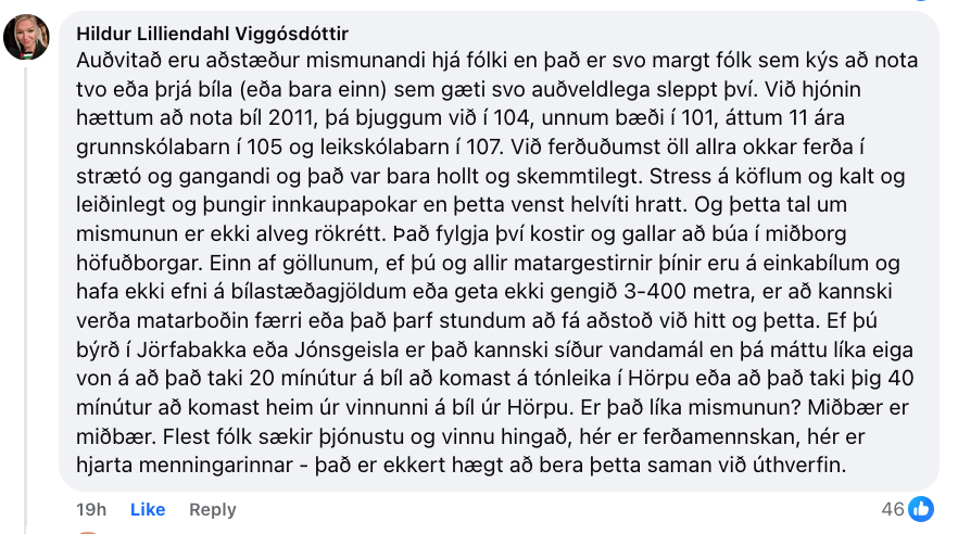 „Þetta tal um mismunun er ekki alveg rökrétt. Það fylgja því kostir og gallar að búa í miðborg höfuðborgar. Einn af göllunum, ef þú og allir matargestirnir þínir eru á einkabílum og hafa ekki efni á bílastæðagjöldum eða geta ekki gengið 3-400 metra, er að kannski verða matarboðin færri eða það þarf stundum að fá aðstoð við hitt og þetta. Ef þú býrð í Jörfabakka eða Jónsgeisla er það kannski síður vandamál en þá máttu líka eiga von á að það taki 20 mínútur á bíl að komast á tónleika í Hörpu eða að það taki þig 40 mínútur að komast heim úr vinnunni á bíl úr Hörpu. Er það líka mismunun?“ spyr Hildur.