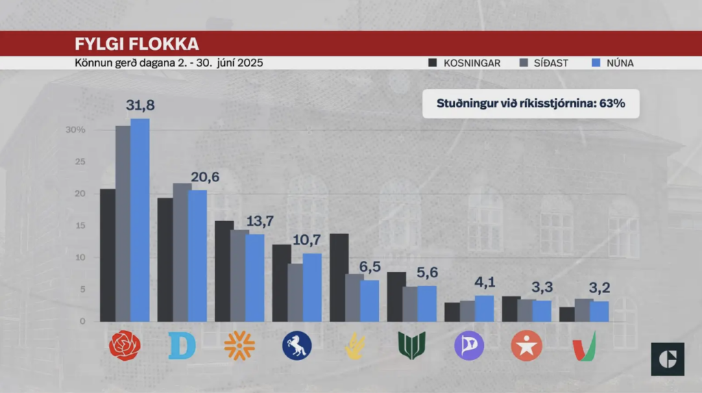 Stjórnarandstaðan á þingi virðist ekki ná að heilla landsmenn og myndi missa þingmann ef kosið yrði nú, samkvæmt júní-könnun Gallup. Ríkisstjórnin bætir við sig, eða öllu heldur Samfylkingin sem myndi bæta við sig átta þingmönnum, tæki einn af stjórnarandstöðunni, annan af Viðreisn og svo sex af Flokki fólksins. Þetta flug Samfylkingarinnar er sögulegt, flokkurinn hefur ekki mælst hærri hjá Gallup síðan 2009, stuttu eftir Hrun.