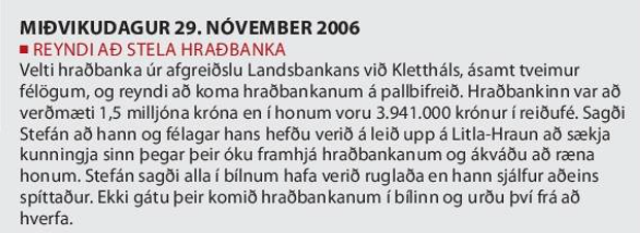 Á tímarit.is er að finna úttekt DV frá 2007 um feril ungra afbrotamanna og þar segir meðal annars frá því að í nóvemberlok árið 2006, hafi téður Stefán Blackburn, ásamt tveimur öðrum, gert álíka tilraun til að ræna hraðbanka úr afgreiðslu Landsbankans við Klettháls. Hraðbankinn sem þeim ku hafa tekist að losa úr veggnum hafði að geyma tæpar fjórar milljónir í reiðufé. Líkt og sjá má á úrklippunni hér að ofan komust Stefán og félagar þó ekki langt, misfórst að koma bankanum á pall bílsins. Þeir létu sig hverfa.
