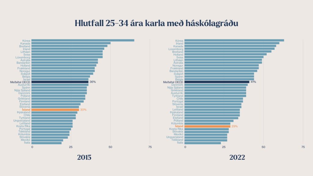 Education at a Glance 2023, ný skýrsla OECD um menntamál, leiðir í ljós að óvíða meðal OECD-landa eru fleiri karlar aðeins með grunskólapróf en á Íslandi, og aðeins á íslandi, í Suður-Kóreu og Póllandi fór hlutfall háskólamenntaðra meðal karla lækkandi frá 2015 til 2022. Þetta var meðal þess sem Áslaug Arna Sigurbjörnsdóttir, háskóla-, iðnaðar- og nýsköpunarráðherra, vakti athygli á, á „sjávarútvegsdeginum“ sem haldinn var á miðvikudag, sem eins konar stefnumót stjórnvalda og forsprakka sjávarútvegsfyrirtækja.