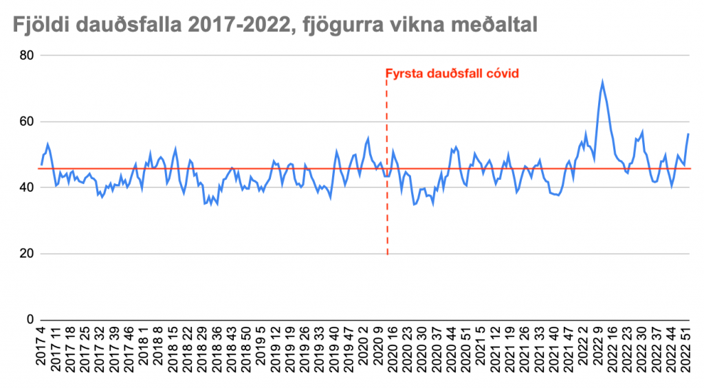 Á myndinni má sjá línurit yfir þróun á vikulegri dánartíðni árin 2017-2022. Til þess að sýna betur þróun vikulegrar dánartíðni eru línurnar í myndritinu tregbreytilegar og miðað við tíu vikna hlaupandi meðaltal í stað þess að sýna hráar talningar gagnanna. Með þessu móti er auðveldara að bera saman og skoða þróun yfir þau ár sem liggja til grundvallar enda er vikuleg dánartíðni yfirleitt mjög lág á Íslandi og tölurnar talsvert flöktandi frá einni viku til annarrar.