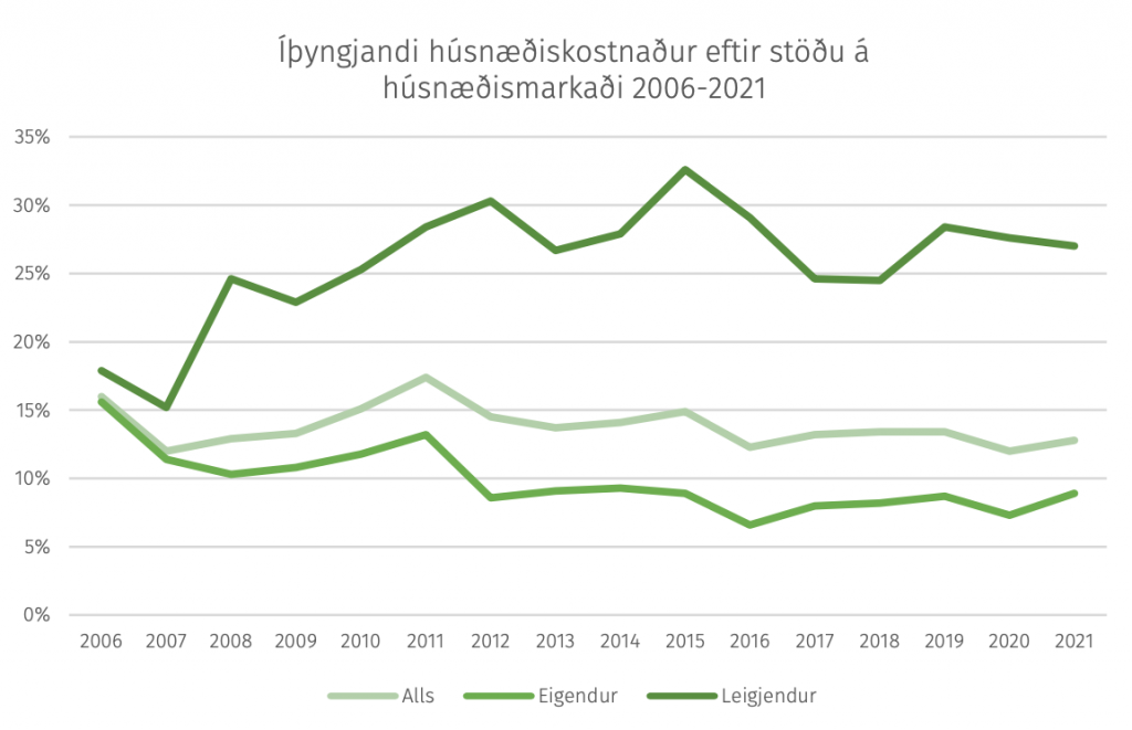 Í grænbókinni er graf sem sýnir íþyngjandi húsnæðiskostnað frá 2006 til 2021 eftir stöðu á húsnæðismarkaði.