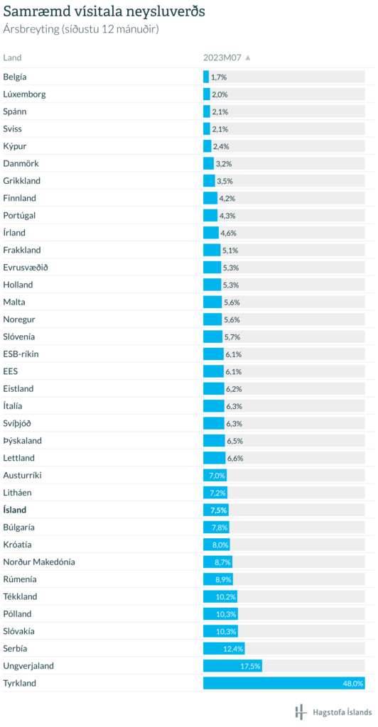 Samkvæmt samræmdri vísitölu evrópsku hagstofunnar var verðbólga hér 7,5% í júlí, meiri en í öðrum löndum Vestur-Evrópu. Þar hafa áhrif hækkunar á orku gengið niður. Verðbólga mældist 6,5% í Þýskalandi í júlí og 5,1% í Frakklandi. Á Norðurlöndunum er verðbólga mest í Svíþjóð, 6,3%, en minnst í Danmörku, 3,2%.