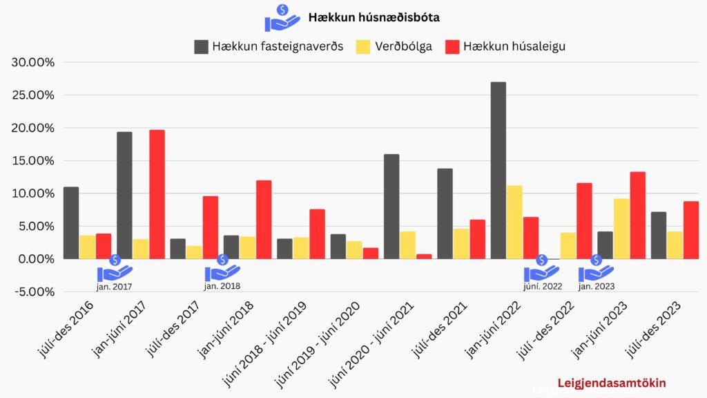 6. Stjórnvöld köstuðu svo bensíni á bálið með því að ráðast í frekari hækkun á húsnæðisbótum í janúar 2023. Reyndar var sú hækkun að sama skapi veik tilraun til að draga úr rýrnun á raunvirði þeirra sem hafði hrapað enn frekar vegna aukinnar verðbólgu. Með þessari tveimur hækkunum á stuttum tíma tókst stjórnvöldum þó ekki einu sinni að endurheimta raunvirði bótanna. En hækkun á bótum þýðir jú takmarkaða og tímabundna aukningu á greiðslugetu leigjenda sem mikið var gert úr á vettvangi stjórnvalda, við góðar undirtektir margra úr heildarsamtökum stéttarfélaganna. Sumir hverjir játuðu þó því á þessum tímapunkti að hækkun húsnæðisbóta væri einfaldlega í eðli sínu niðurgreiðsla á húsnæði leigusalanna, sem höfðu fengið þrjú hundruð prósenta virðishækkun á húsnæði á einum áratug og leigusalar hundrað og fimmtíu prósent hækkun á húsaleigu. En þrátt fyrir fullkomna vitneskju um slíkt óráð að hækka húsnæðisbætur á óregluvæddum leigumarkaði varð það nú samt raunin. Á þeim sex mánuðum sem liðu frá því að húsnæðisbæturnar voru hækkaðar í janúar 2023 hækkaði húsaleiga um rúmlega tæplega sjö prósent eða þrettán og hálft prósent á ársgrunni, þrefalt meira en húsnæðisverð og fimmtíu prósent meira en verðbólga.